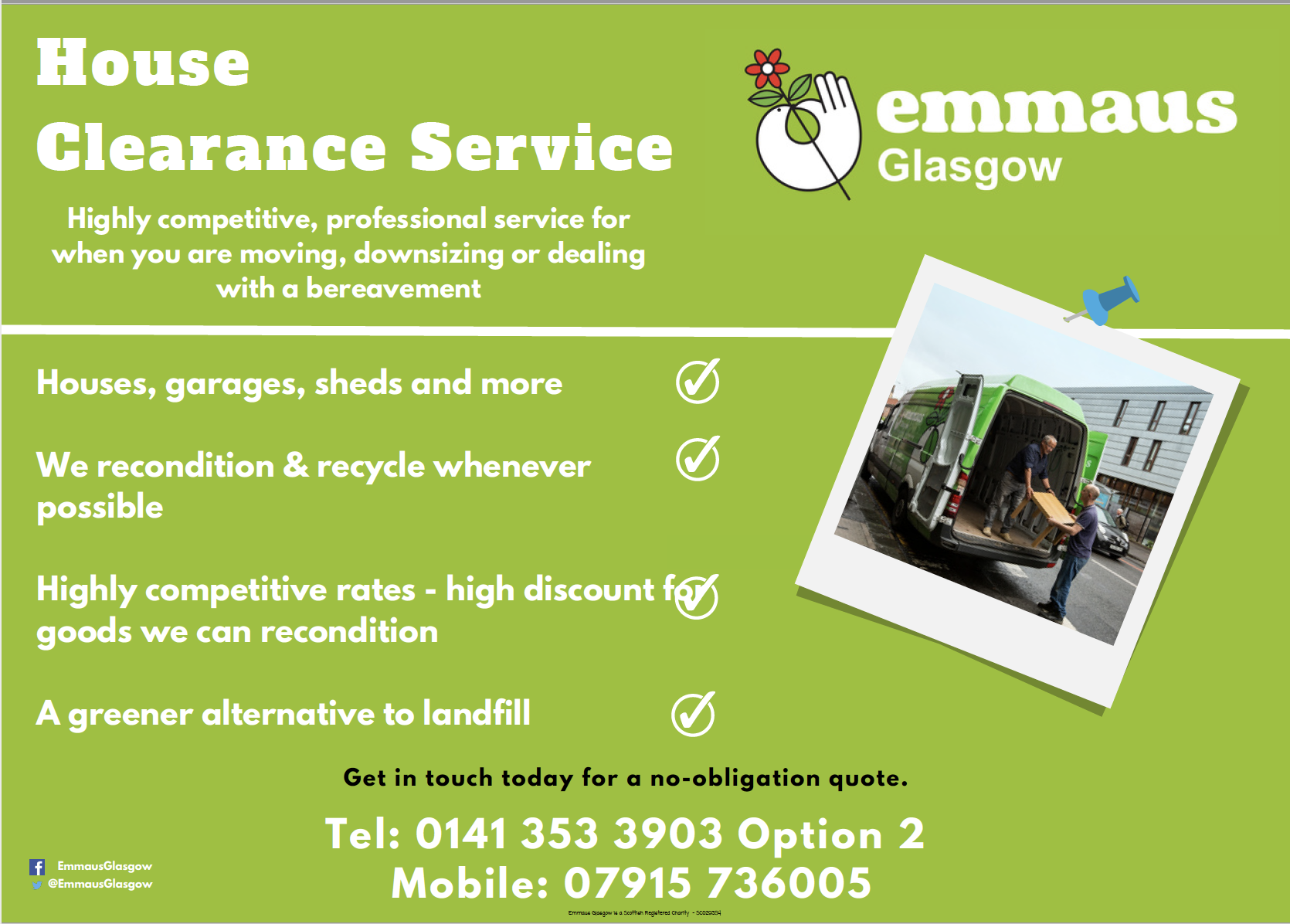 For a quick, friendly and efficient house clearance service, contact Emmaus Glasgow using the form below to arrange a visit and a quote or give us a call on 0141 353 3903 or Whatsapp 07915 736005.